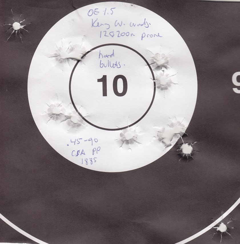 Here is the last 12 shot 200m prone target I shot with the .45-90 before my miserable performance in Phoenix when I completely failed to manage bore fouling. Discounting the two pulled shots, the rifle held 2.1" of vertical which is less than a minute tall at that distance.