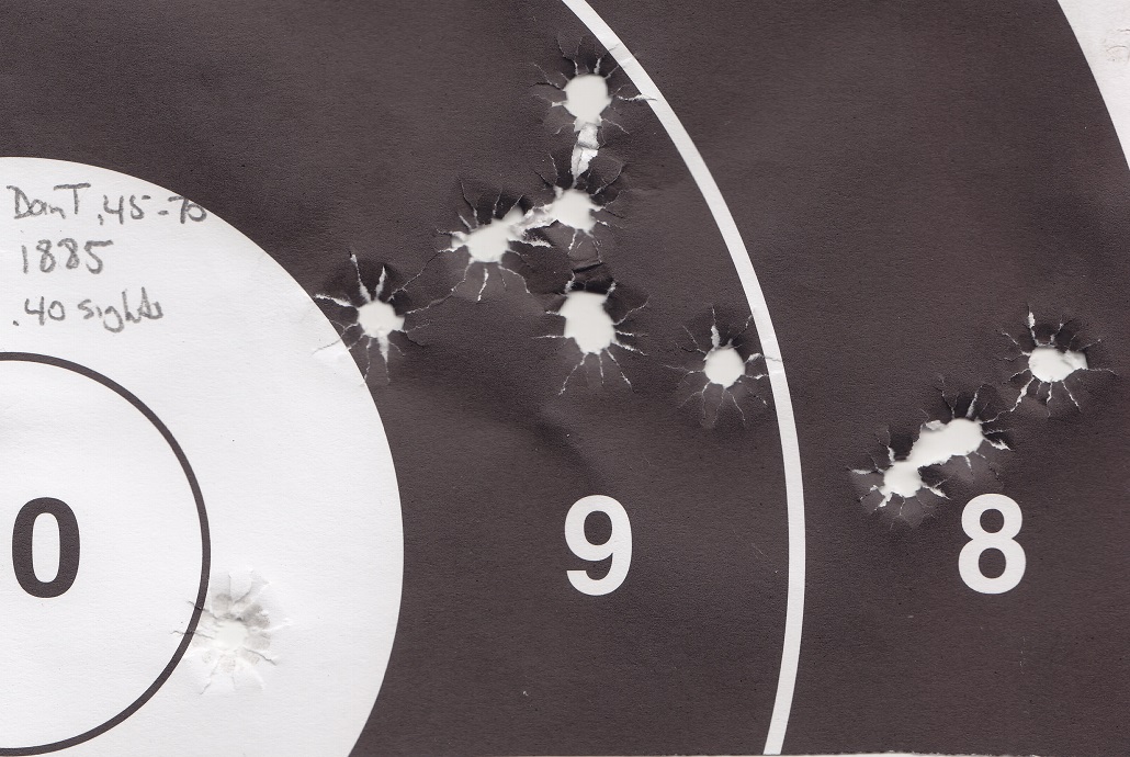 An original Winchester 1885 chambered with Dan's .45-70 reamer. Here a group shot at 200m. This is the first load I shot through this rifle and the second target ever shot with this rifle. The first target was used to get an elevation setting. Dan's reamer design works very well.